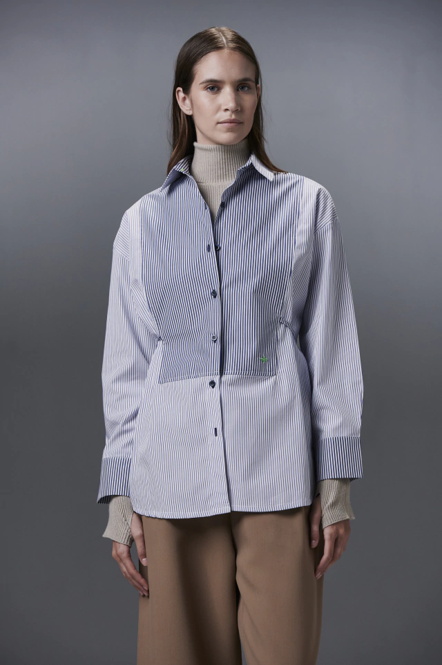 Camisa de Poplin de Algodón. De silueta cómoda con mezcla de dos tipos de rayados. Botones de nácar a tono. Detalle de ojal en cuello y puós en tono lima. Bordado en color lima al frente. Posee tiras del mismo textil para anudar.