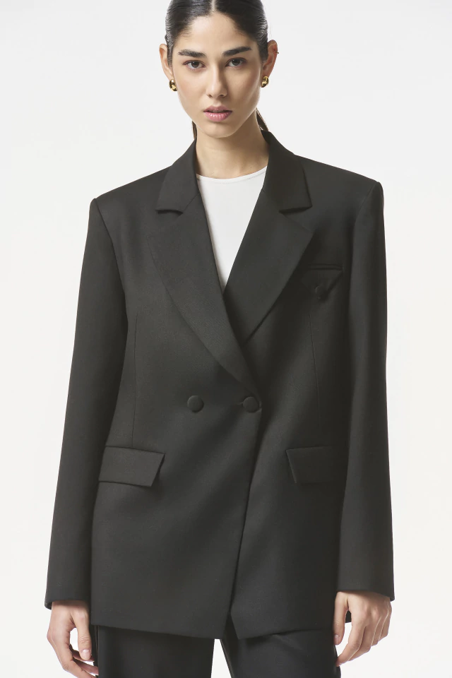 Blazer cruzado. De silueta entallada, con hombreras marcadas y bolsillos ojal al frente. Posee botones forrados del mismo género para un diseño límpio y elegante con bolsillo tipo smoking triángulo. Su interior se encuentra íntegramente forrado con tafeta jacquard. Disponible también en color Negro.