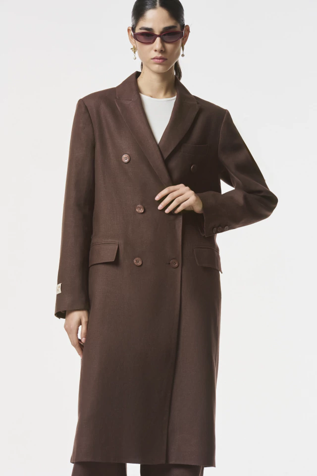 Blazer largo de 100% Lino. Silueta recta cruzada con botones delanteros de nácar a tono. Bolsillo smoking al frente y bolsillos reales con solapa. En la espalda posee un tajo en la parte central inferior. En espalda contiene cadena bronce personalizada de la marca. Posee forrería con tafeta personalizada y etiqueta personalizada de la marca en la manga. Disponible también en color Diplomatic black, Navy & Off white.