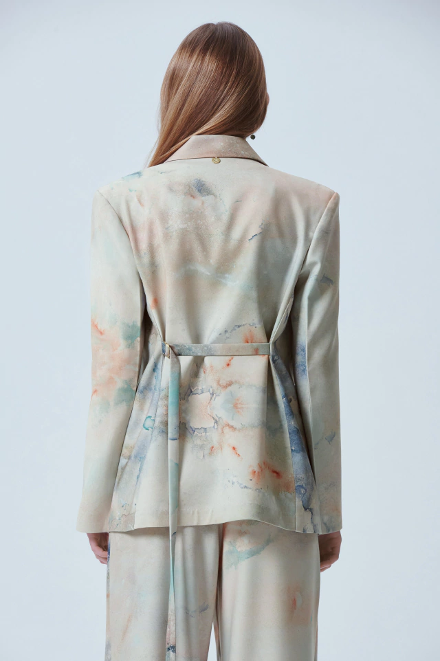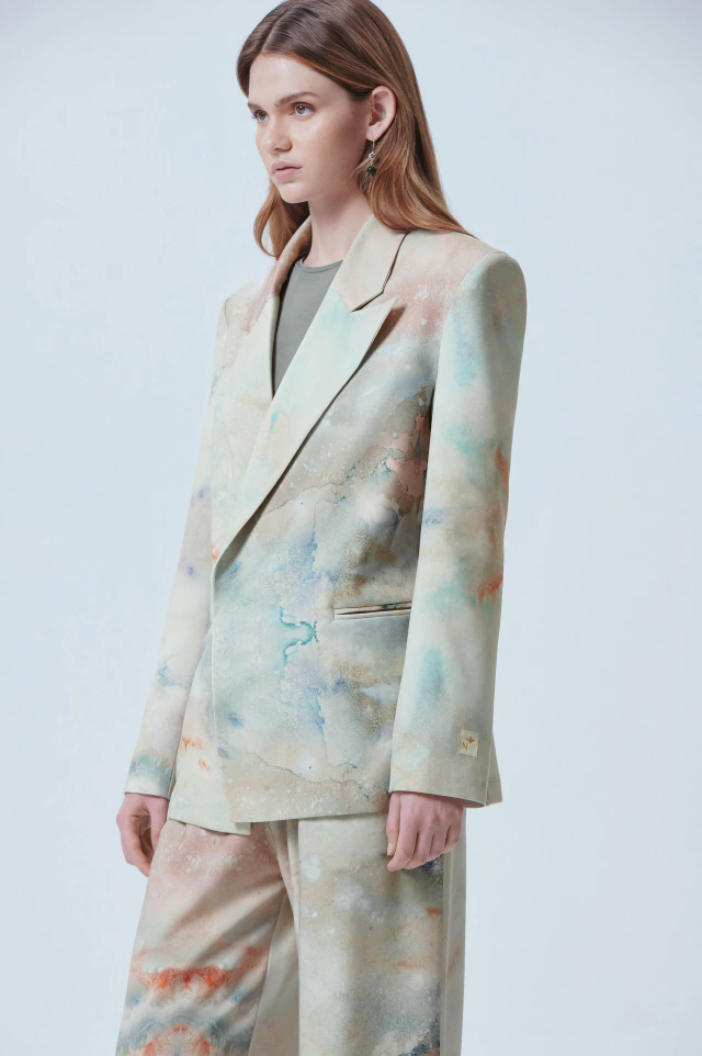 Blazer con hombreras cruzado. De silueta semi-entallada regulable con botones de pasta internos, y bolsillos ojal al frente. En su espalda posee tira del mismo textil con dos medialunas metálicas doradas para regular su ajuste. En su manga contiene etiqueta tejida con el logo de la marca.