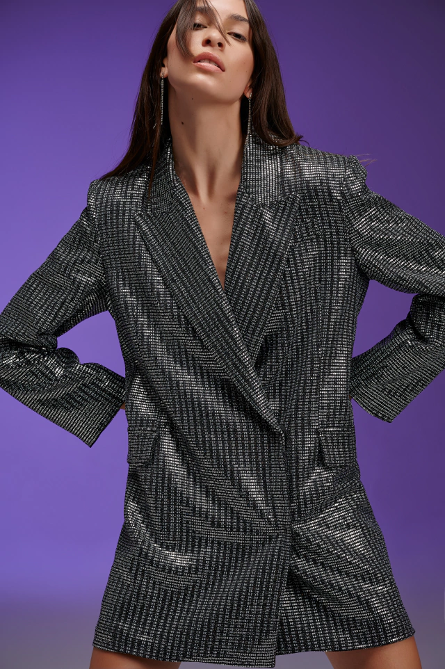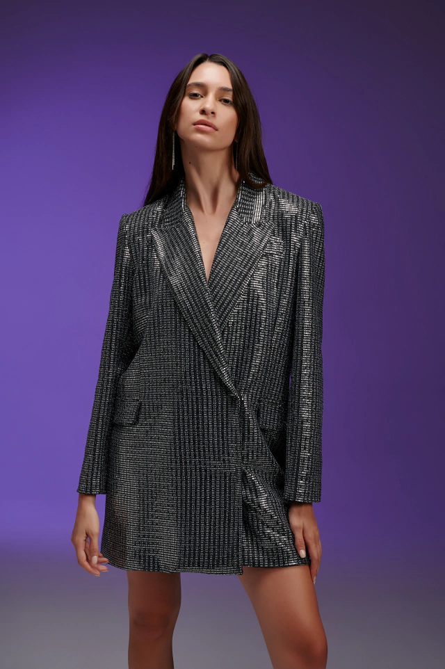 Un blazer versátil y único. Usalo como vestido o sino combinalo con el Top Avarizia y el Pantalón Avarizia para un total look brillante y elegante.