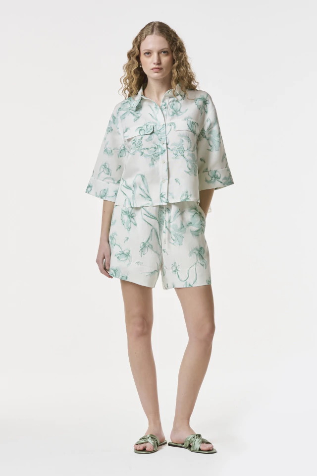Camisa de lino. De silueta recta con mangas 3/4, con botones de nácar al frente y bolsillos con solapa aplicados. Posee dobladillo en puños y chapita metálica en espalda. Estampa única creada para la colección Capriccio SS26. Disponible también en Sand and Black & Navy.