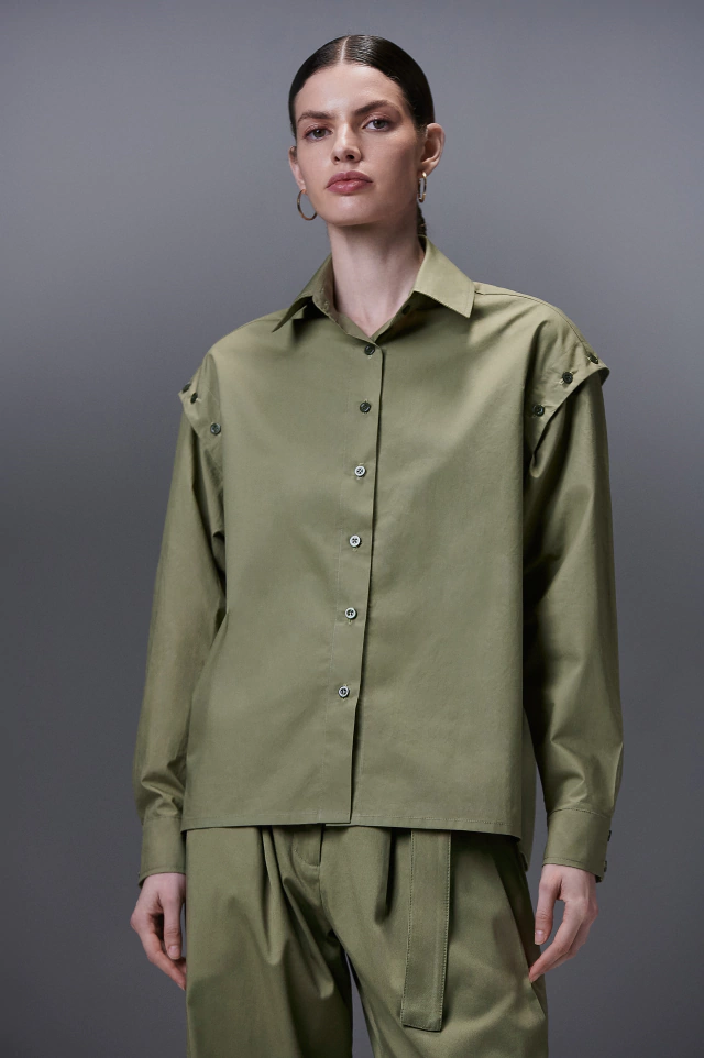 Camisa de Poplin de Algodón. De silueta recta con mangas abullonadas con aberturas laterales opcional. Posee botones de nácar a tono.