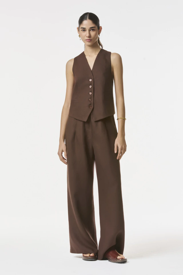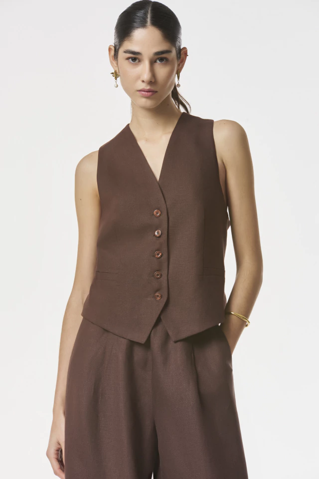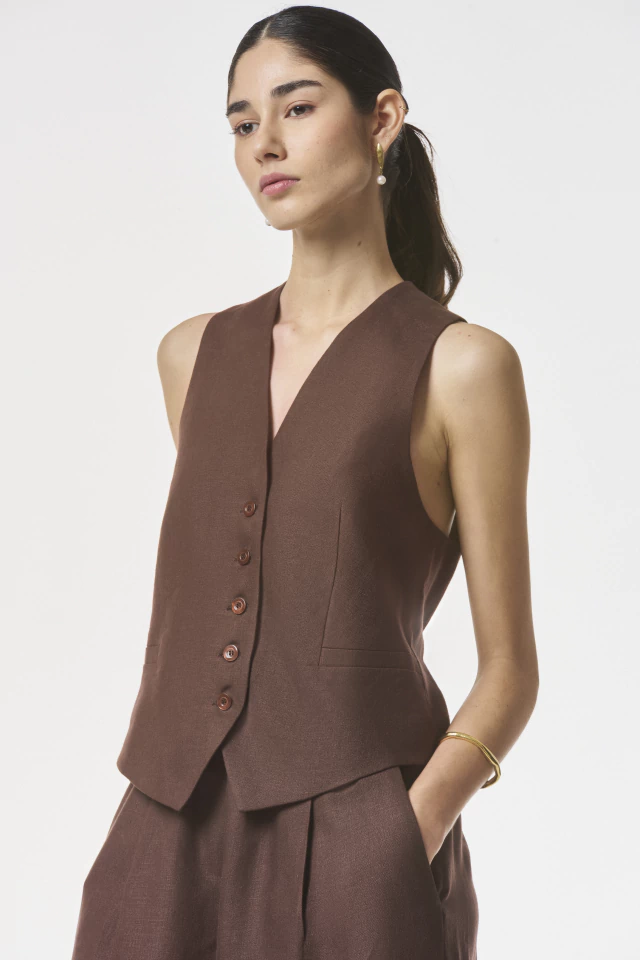 Chaleco Sastrero confeccionado en 100% Lino. Silueta recta con botones delanteros de nácar a tono y bolsillos ojal. En su espalda contiene etiqueta personalizada y presilla con medialunas metálicas para ajustar la cintura. Disponible también en color Off white, Toffee & Stampa Fiori Blue.