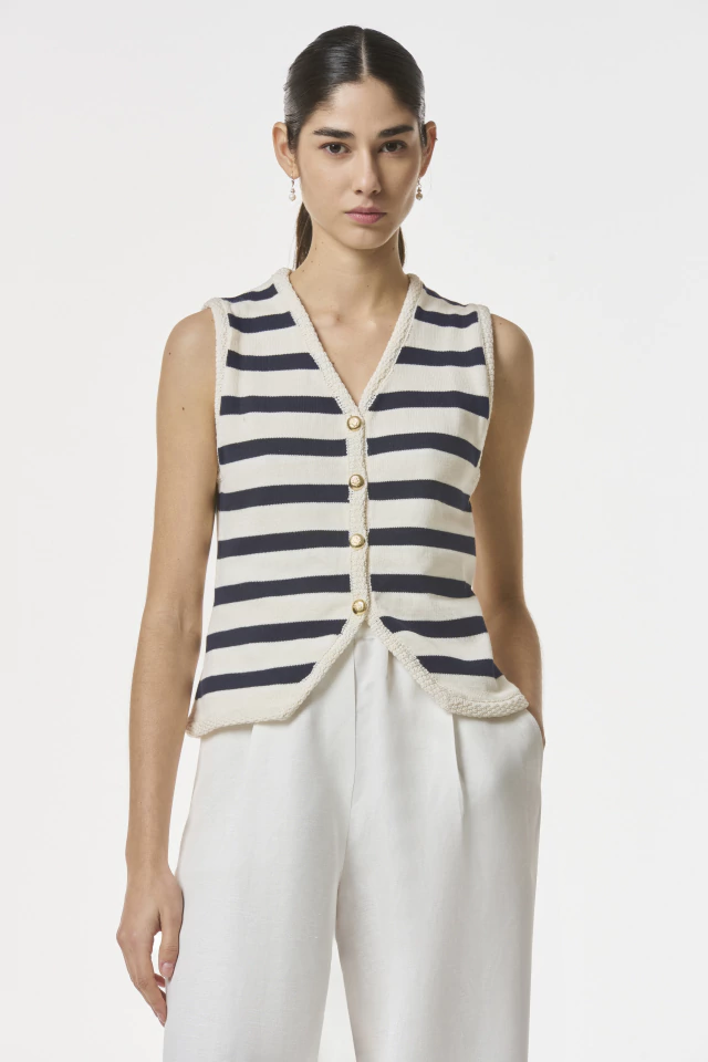 Chaleco tejido en hilado 100% Algodón. Largo a la primera cadera y escote en "v." Confeccionado en punto liso con vivos en punto arroz. Botones metálicos dorados al frente. Disponible también en color Ivory y Scarlet.