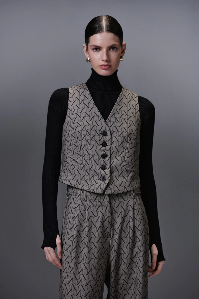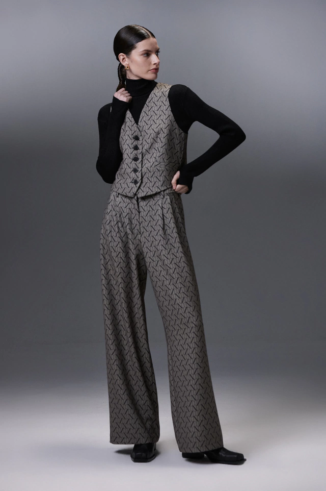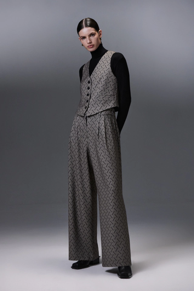 Composición: 93% Poliéster - 7%Spandex. Textil sastero premium de mano suave con peso y estructura media. Forrería con Tafeta Jacquard.