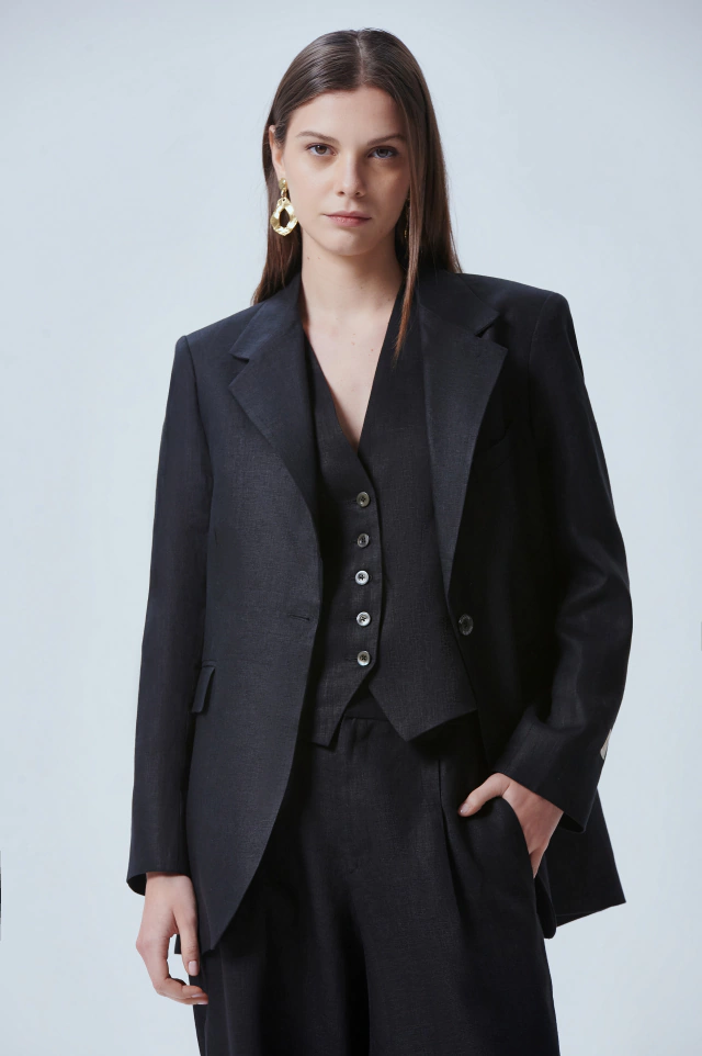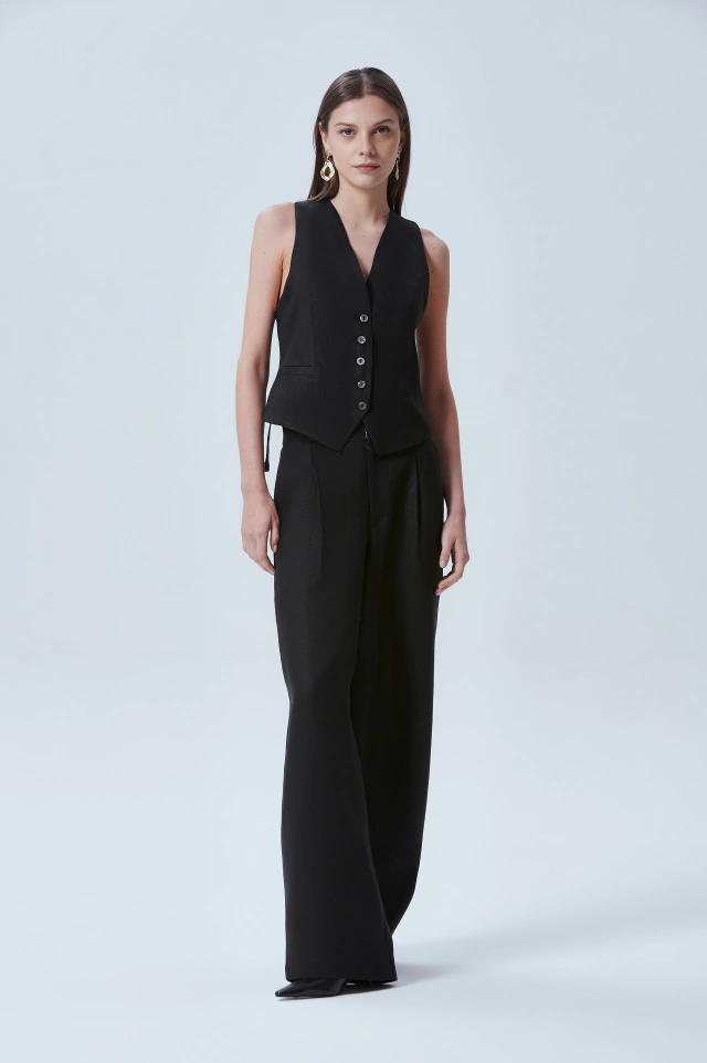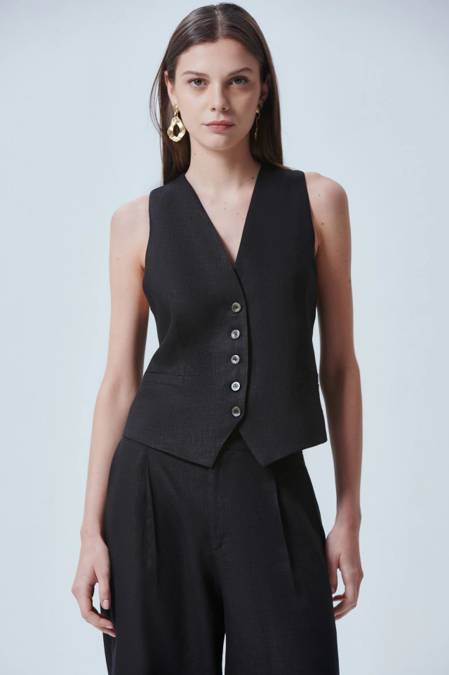 Chaleco Sastrero confeccionado en 100% Lino. Silueta recta con botones delanteros de nácar a tono y bolsillos ojal.