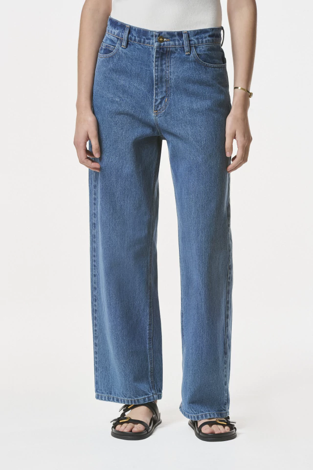 Jean Wide-leg. Cintura alta con cierre metálico y botón personalizado al frente. Posee bolsillos laterales, bolsillos plaqué traseros. En la cintura trasera contiene badana de cuero y chapita personalizada dorada de la marca. El modelo clásico y cómodo para cualquier momento del año.