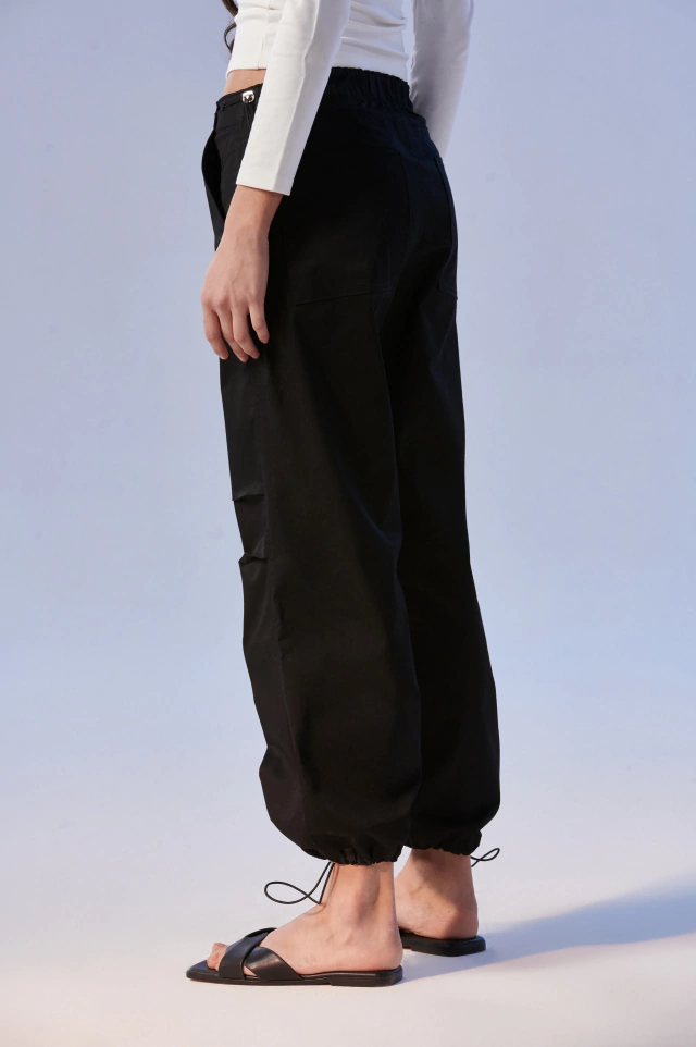 Bolsillos laterales y traseros. Elásticos a tono con tancas metálicas en cintura y tobillos.