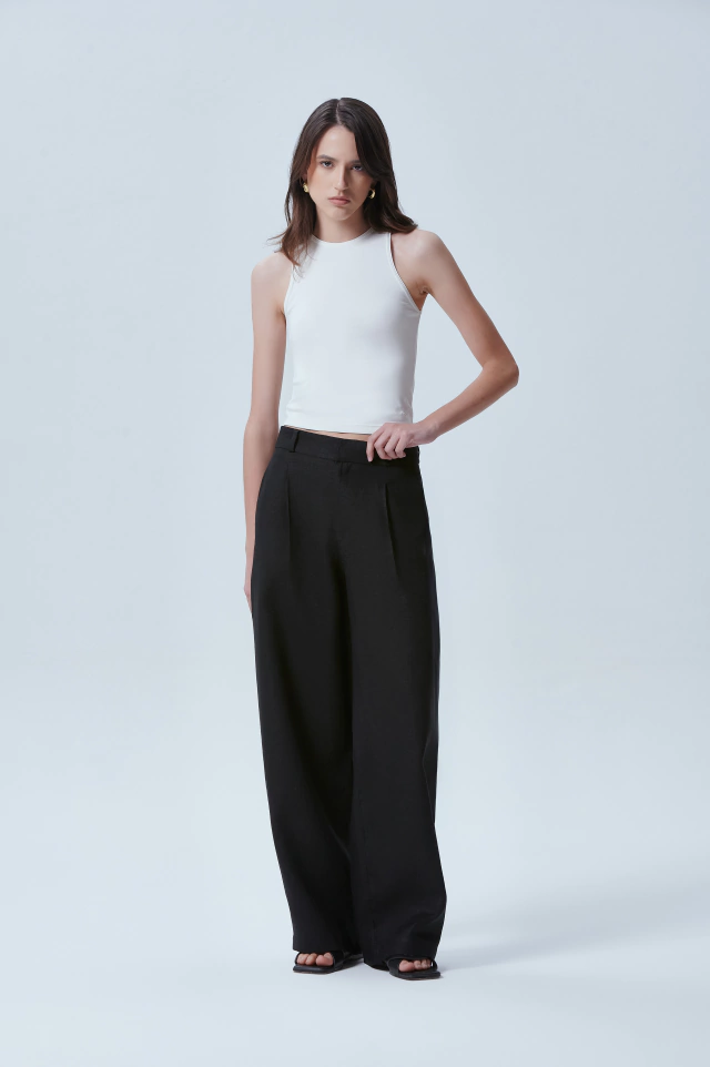 Pantalón sastrero confeccionado en 100% Lino. Silueta Wide Leg con cierre frontal y broches pantaloneros. Posee cintura alta de 5 cm con elástico en la cintura trasera. Bolsillos laterales reales y bolsillos ojal traseros.