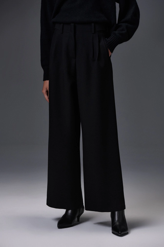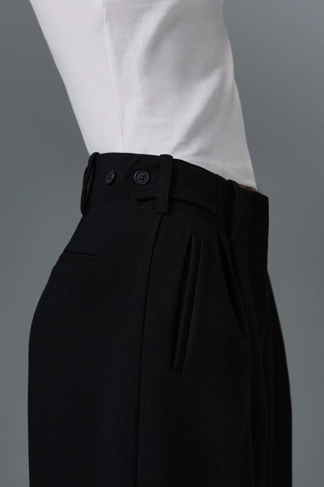 Pantalón sastrero con pinzas. De cintura alta con cierre y broches pantaloneros al frente. Bolsillos ojal laterales y traseros. Posee presilla con dos botones para regular el tamaño de la cintura.