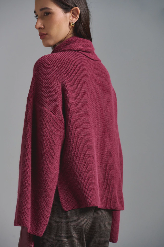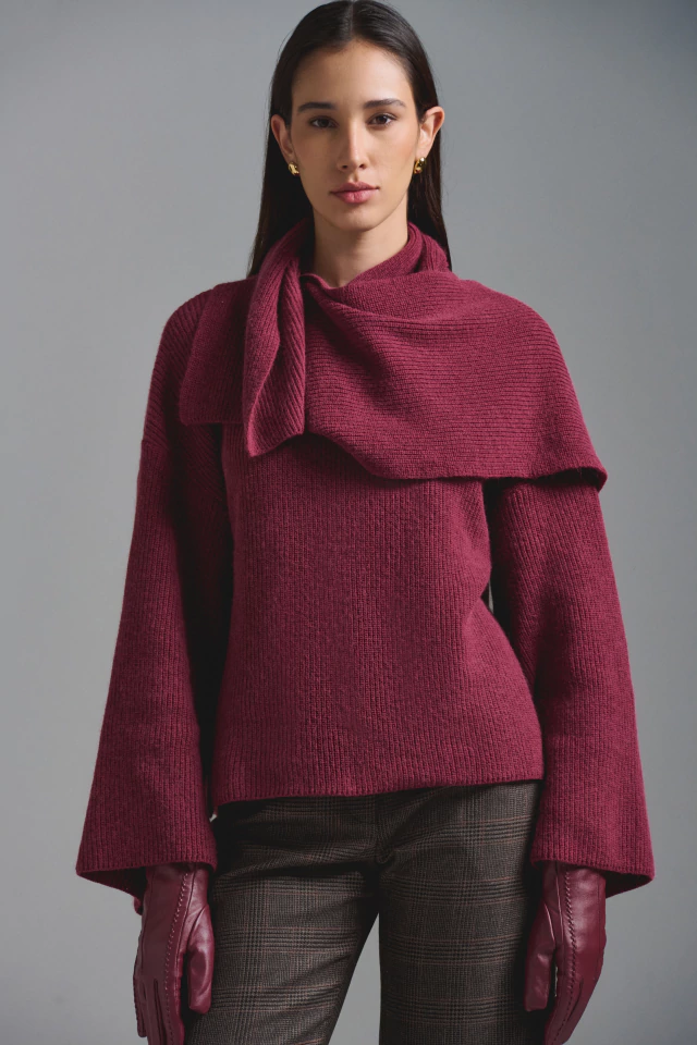 Sweater con bufanda. De silueta holgada con mangas estilo acampanadas y tajos a los costados a la altura de la cadera para mayor comodidad. Confeccionado en punto jersey con bufanda incorporada dentro del mismo sweater. Disponible también en color Ivory.