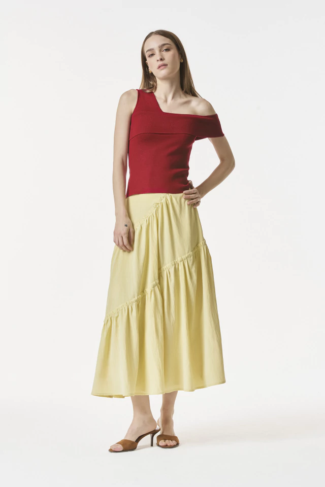 Top tejido asimétrico. De silueta fit pero debido a su punto cómodo al uso. Confeccionado en punto liso con hilo de viscosa. Disponible también en color Black.