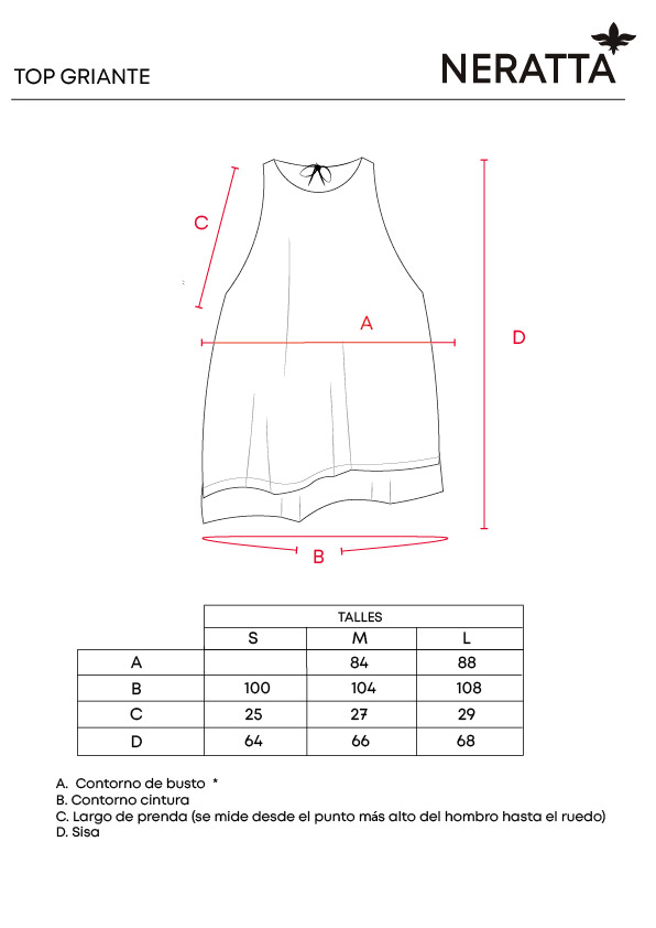 Medidas: disponible del talle S al L. Maria utiliza talle S y sus medidas son 82/60/87, Altura 1,74. Encontrá más detalles en el botón "Guía de talles" o consultanos por Chat privado o WhatsApp para una atención más personalizada.