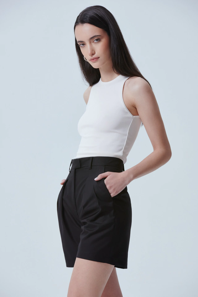 Bermuda sastrera con pinzas. De cintura alta con cierre y broches pantaloneros al frente. Bolsillos laterales y ojal traseros.