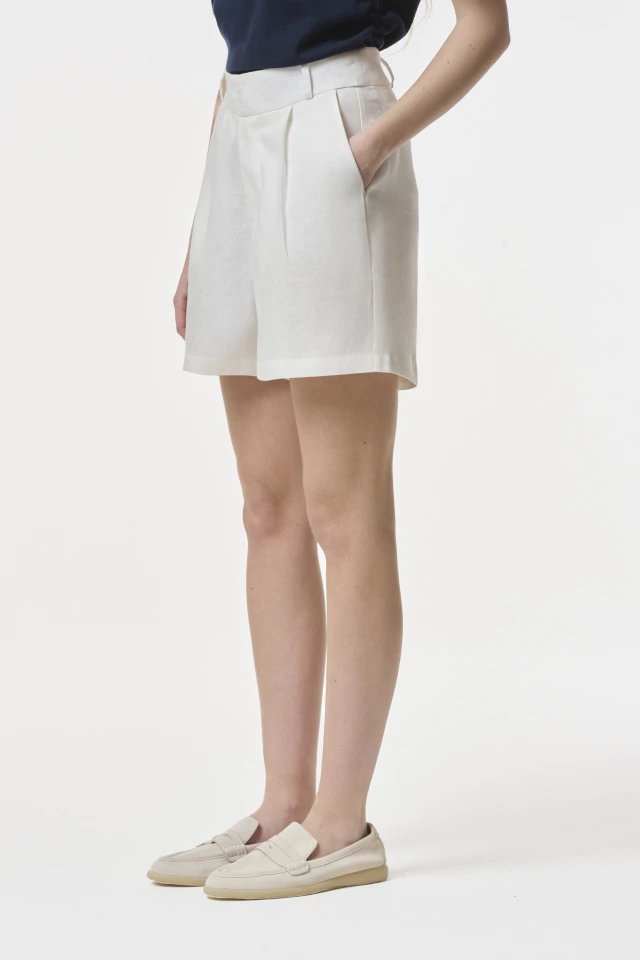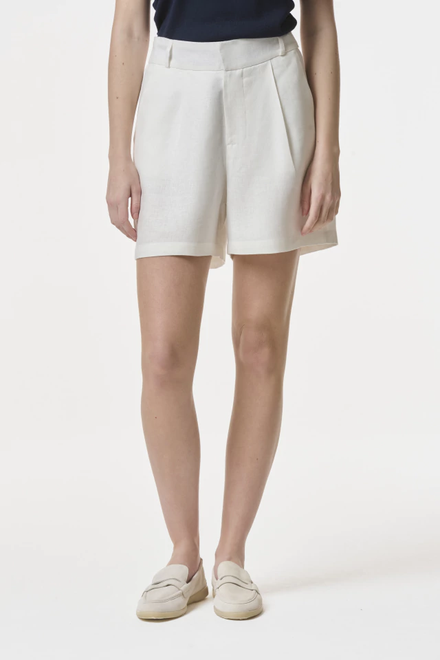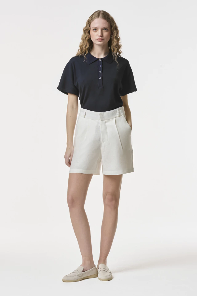 Bermuda sastrera confeccionada en 100% Lino. Silueta cómoda con cierre frontal y broches pantaloneros. Posee cintura alta de 5 cm con bolsillos laterales reales y bolsillos ojal traseros.