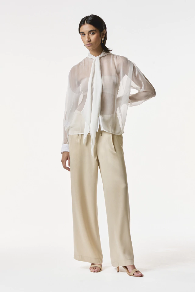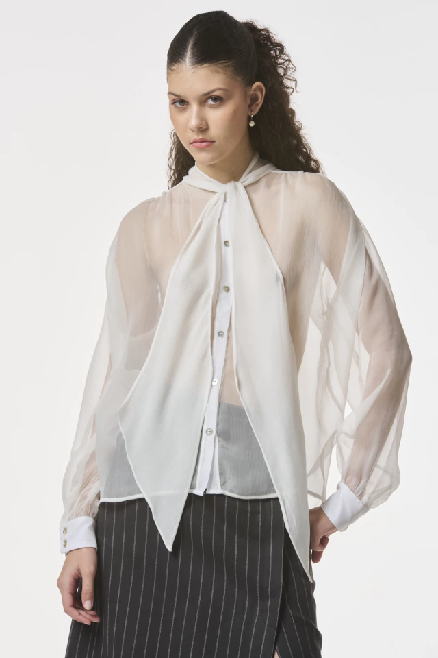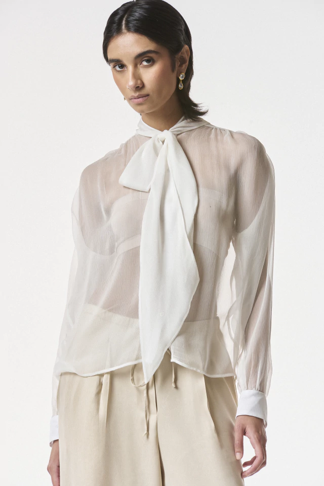 Camisa confeccionada en Gasa de seda natural. De silueta holgada con mangas abullonadas y cuello con lazo del mismo textil. Contiene botones de nácar tornasol al frente y en puños. Disponible también en color Black. No incluye top interior.