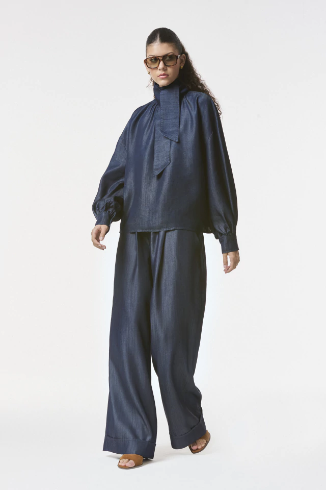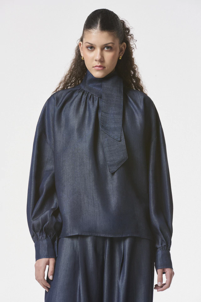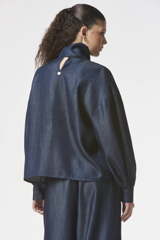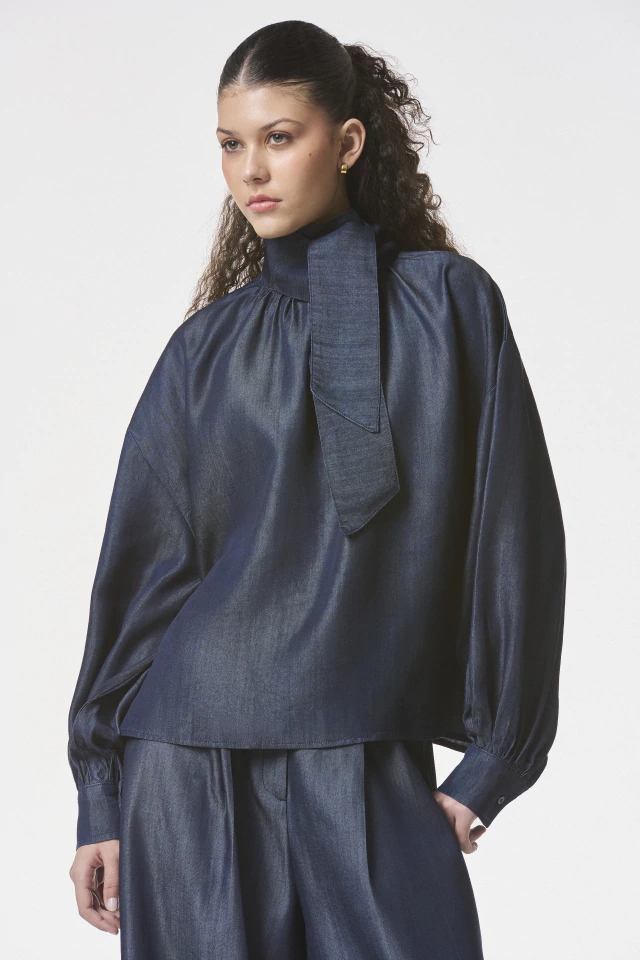 Camisa confeccionada en Denim Tencel. De silueta amplia con mangas abullonadas y cuello alto con lazo. Acceso en forma de gota en la espalda. Disponible también en color Poplin Off white.