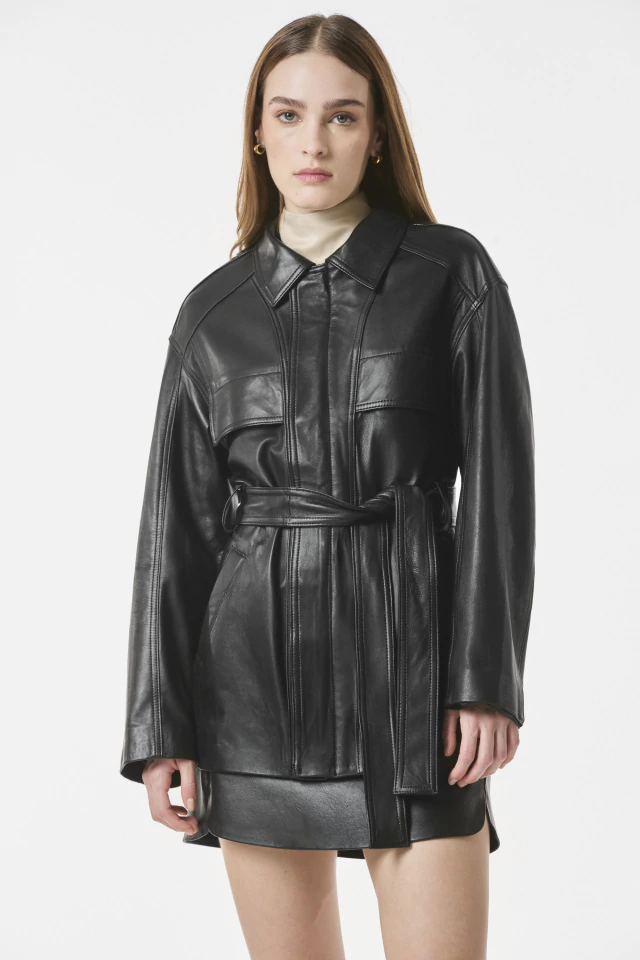 Chaqueta de cuero ovino. De silueta recta con recortes, acceso al frente con cierre metálico y broches snaps ocultos. Bolsillos con solapa al frente y a los costados. Posee lazo desmontable del mismo textil. Su interior se encuentra íntegramente forrado con tafeta jacquard. Contiene cadena de bronce en la espalda personalizada de la marca. Disponible también en color Chocolate.