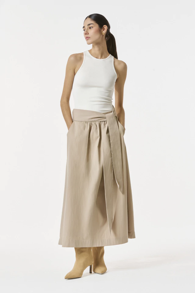 Falda de gabardina. De silueta en evasé y largo midi con elástico en la cintura trasera y lazo incorporado del mismo textil. Posee bolsillos laterales reales y se encuentra íntegramente forrado con tafeta apaisada. Disponible también en color Kaki.
