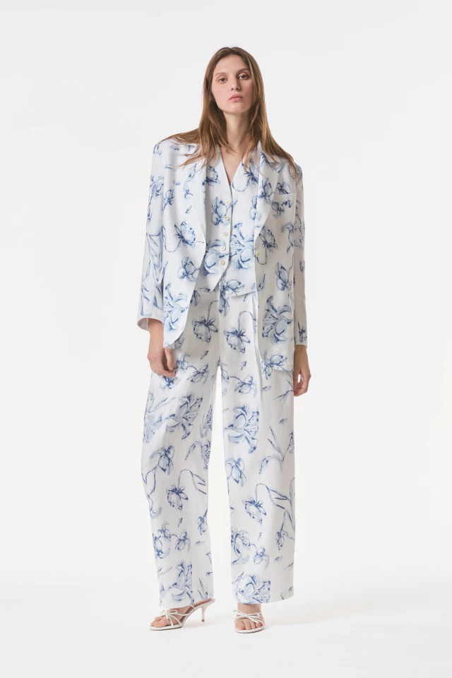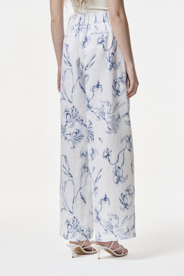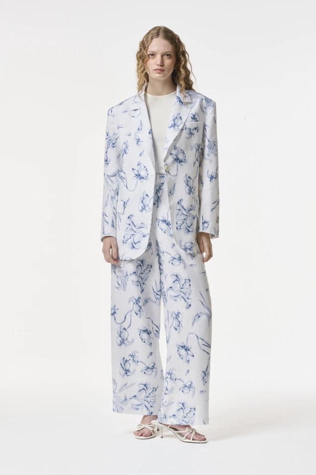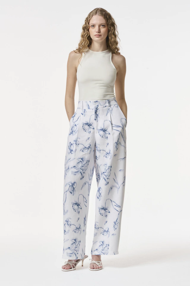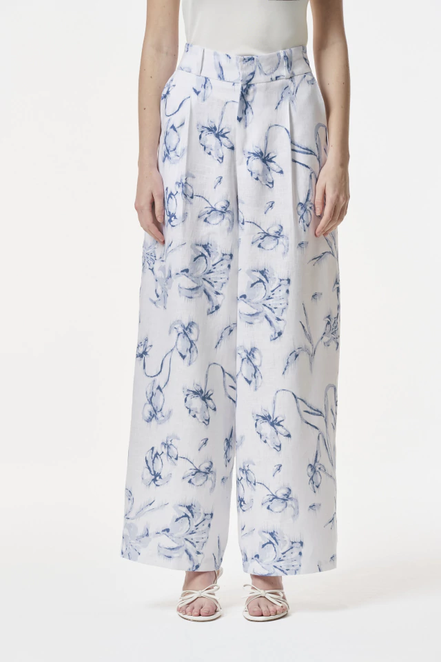 Pantalón sastrero confeccionado en 100% Lino. Silueta Wide Leg con cierre frontal y broches pantaloneros. Posee cintura alta de 5 cm con elástico en la cintura trasera. Bolsillos laterales reales y bolsillos ojal traseros. Disponible también en color Chocolate, Toffee & Off white. Estampa única creada para la colección Capriccio SS26.