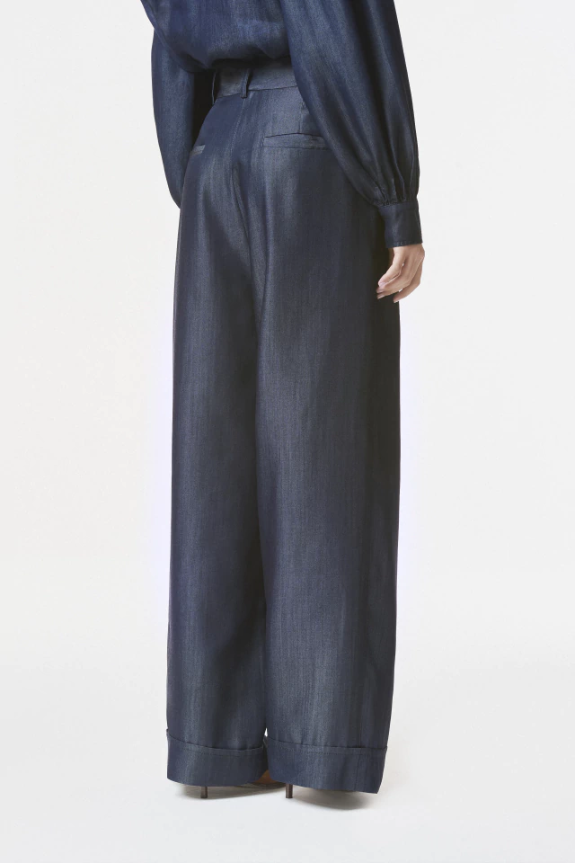 Pantalón sastrero con pinzas confeccionado en Denim Tencel. De cintura alta con cierre y broches pantaloneros al frente. Bolsillos laterales, presillas decorativas en cintura con botones a tono y doblez en botamanga. Disponible también en color Cream, Navy y Chocolate.