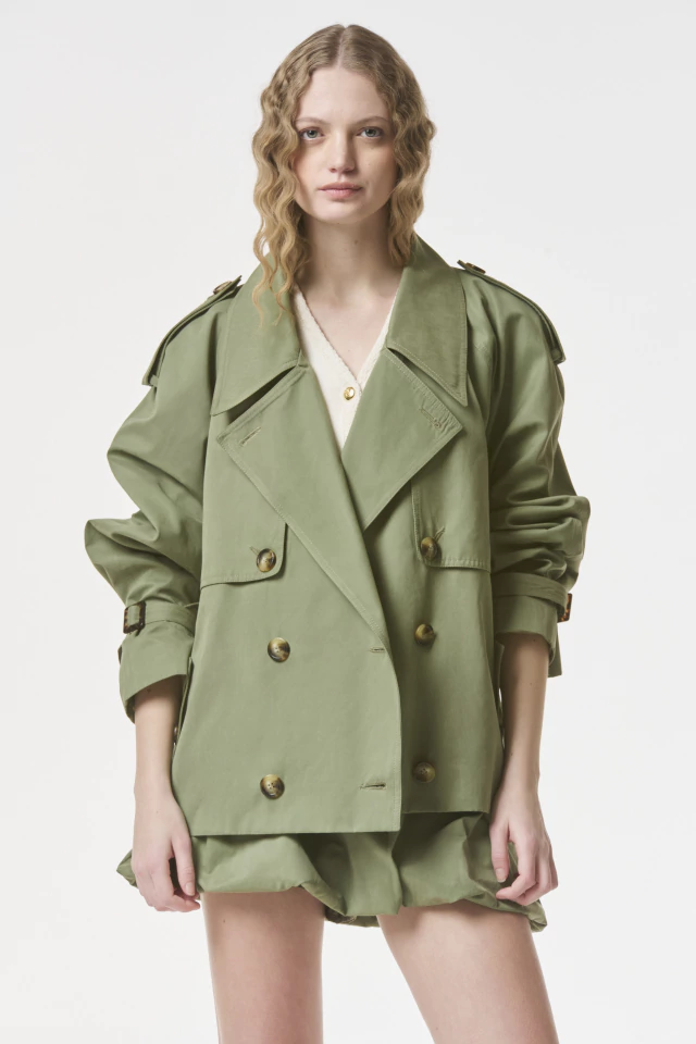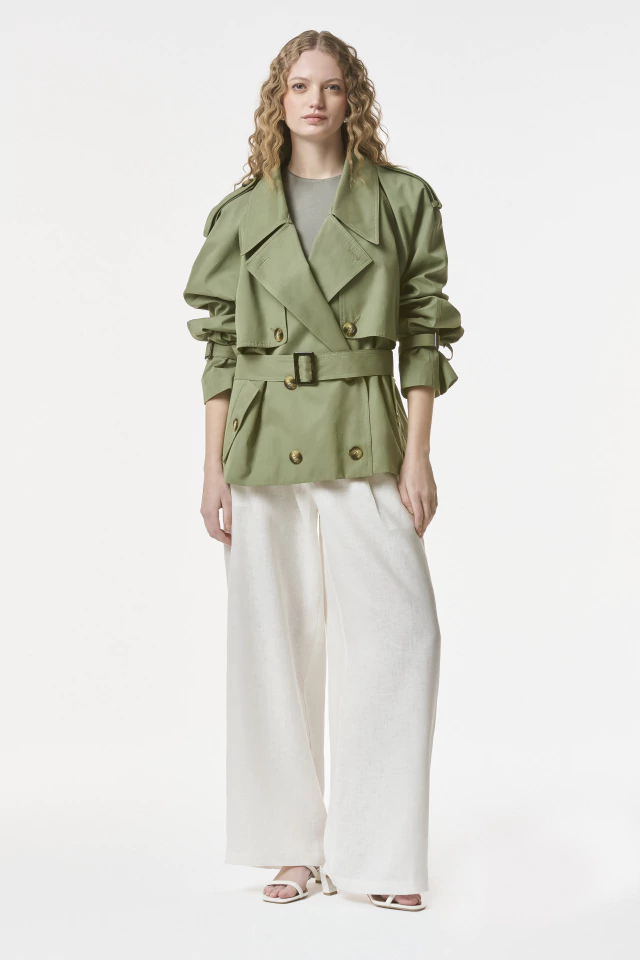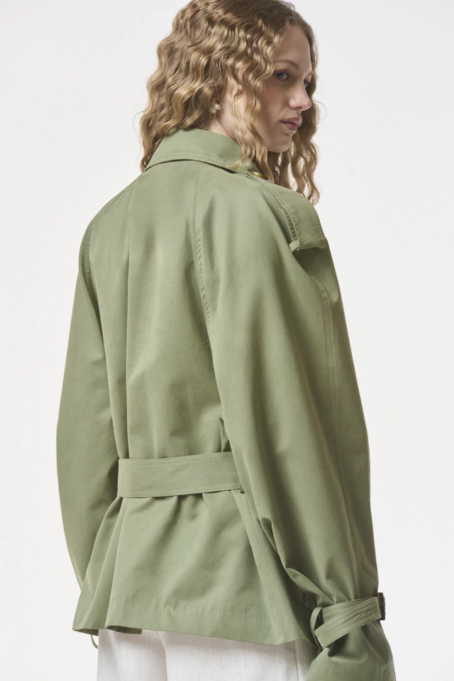 Short Waterproof Trench Coat: Relaxed-fit trench coat made from waterproof gabardine. Features removable and adjustable cuff tabs, shoulder epaulettes, and a detachable belt in matching fabric. Front fastening with covered resin buttons and tone-on-tone buckles. The inside features an exclusive “Cool & Classic” brand label. Also available in Sand color.