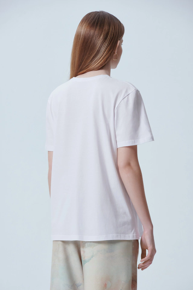 Remera oversize. Con mangas cortas y largo por debajo de la segunda cadera. Cuello redondo y calce cómodo.
